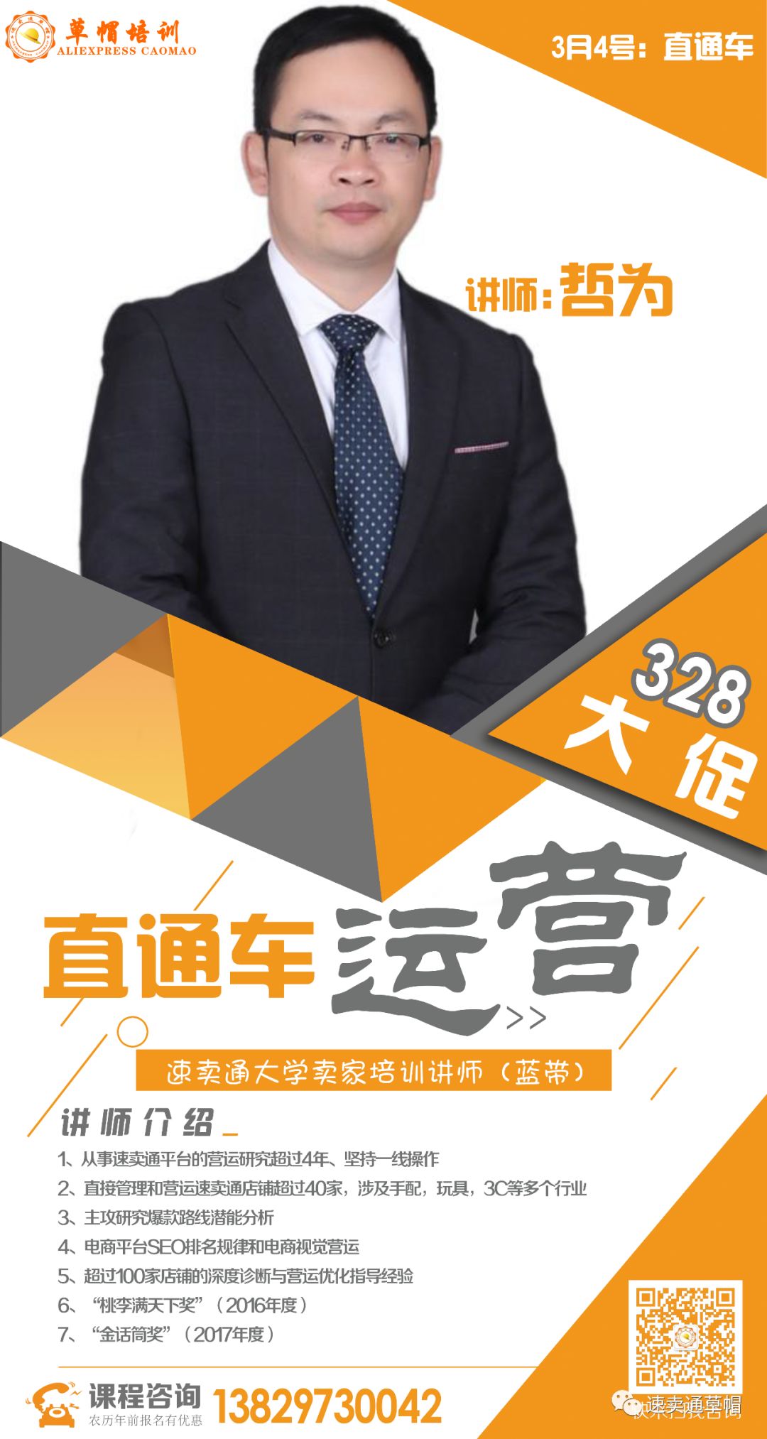 2014年至2017年受阿里巴巴速卖通大学委派在全国各主要城市从事速卖通实战培训超过40场,荣获阿里巴巴速卖通大学“金麦奖”(2015年度)、“桃李满天下奖”(2016年度)、“金话筒奖”(2017年度)