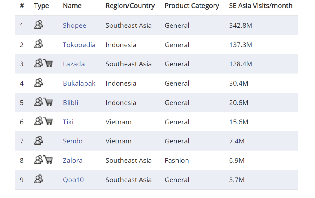 成立于2010年的Bukalapak是印度尼西亚第三大在线市场,月均访问量为3000万次,仅次于Tokopedia和Shopee,排在Lazada前。Bukalapak拥有超过600万卖家和9000万活跃用户,平均每天处理200万笔交易。作为一个纯在线市场,Bukalapak没有自己的零售业务。 Blibli成立于2011年,是印度尼西亚的在线零售商和市场,月均访问量达到2060万次。平台上产品范围广泛,并为所有产品提供免费送货和免息信贷。Blibli开展了一项全球卖家计划,为国际卖家提供在该网站销售的机会。 于2012年推出的Sendo是越南的在线市场,月均访问量为740万,平台上主要销售时尚、家居用品和电子产品。Sendo有一个面向其500,000名卖家和为SenMall卖家开放的通用市场,用于销售正品品牌的产品。 时尚零售商Zalora成立于2012年,与拉丁美洲的Dafiti、俄罗斯的Lamoda和澳大利亚的TheIconic并驾齐驱。本身是一个零售商,也是东南亚唯一一个专门销售单一产品类别的线上市场,每月有来自东南亚各地的690万浏览量。印度尼西亚是Zalora的最大市场,其次是菲律宾、新加坡和马来西亚。Zalora在台湾和香港也有本地化站点。 Qoo10是一个位于新加坡的纯在线市场,月均访问量为370万,其中有60%的流量来自新加坡。Qoo10成立于2010年,是eBay与韩国Gmarket创始人的合资企业,最初名为Gmarket,2012年才更名为Qoo10。 Qoo10现在是一家独立公司,除了在日本由eBay全资拥有。跨境卖家也可以在Qoo10上注册和销售。注册费和销售费从6%到12%不等,且需支付100美元的押金。(来源:AMZ123跨境电商)