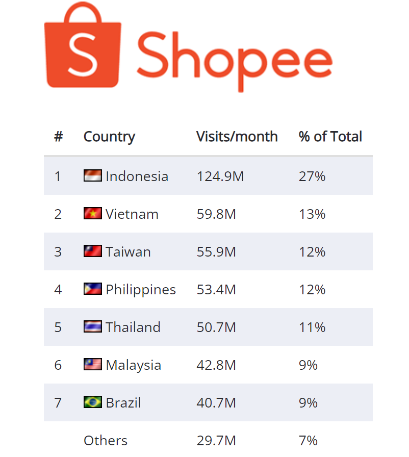 于2015年在新加坡成立的Shopee目前是东南亚最大的在线市场,月均访问量达到3.43亿次。业务几乎遍及整个东南亚,且还在2021年将业务扩展至南美洲,平台上所有产品都由第三方卖家销售。印度尼西亚是迄今为止东南亚最大的经济体,为Shopee贡献了27%的流量。 Shopee在2020年的订单量达27亿笔,GMV(商品总额)同比增加102%达到354亿美元。Shopee商城为东南亚买家提供来自东南亚和全球大大小小的品牌的各种产品。每年Shopee还都会举办全球品牌的“超级品牌日”、9月9日的“9.9购物日”、11月11日的“双十一”、12月12日的“双12”特卖活动。 Shopee通过提供托管服务为买家提供购物保障。买家的付款由Shopee扣留,直到买家或运输服务确认已完成,这笔订单才完成。对于完成订单少于100个的卖家而言,Shopee不收取佣金,并且为卖家提供直播和社交渠道等促销工具。 Shopee为本地小型卖家服务,而Shopee商城为品牌商和授权分销商服务。Shopee商城的卖家必须确保销售正品,承诺提供15天退货服务,并提供免费送货或与Shopee支持的物流供应商达成物流合作。Shopee商城的佣金范围为2%-5%。