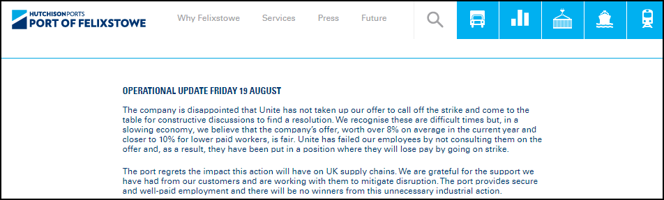 该港口表示这次罢工不会产生赢家,对于其对英国的供应链产生的影响表示遗憾。并且感谢客户的支持,正在与他们合作以减轻干扰。