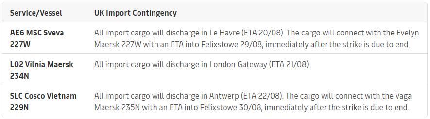 当地时间 8 月 21 日起,英国最大集装箱港口费利克斯托港(Felixstowe)约 2000 名工人已正式启动为期 8 天的大规模罢工。将对英国货运及物流行业造成严重影响,导致船舶延误并迫使船公司船只改道等。