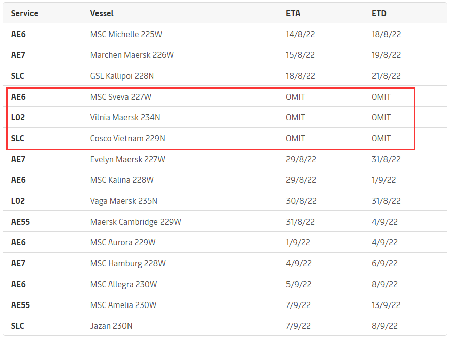 对于取消挂靠的三艘船——AE6 MSC Sveva 227W、L02 Vilnia Maersk 234N 和 SLC Cosco Vietnam 229N——计划的应急措施如下: