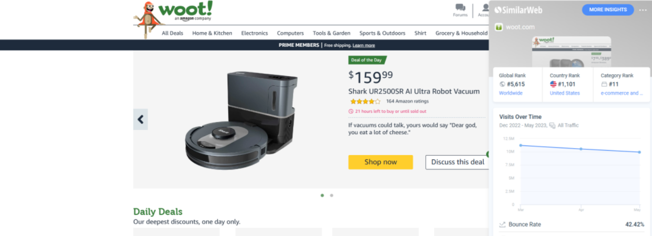 ①Woot Deals:WOOT官网本身有巨大的流量,其次作为亚马逊亲儿子,它的秒杀直接展示在亚马逊站内,同样带有BD秒杀的标志。平均每月访问量900万左右,一般只要能报上,在如此流量前单量都是比较理想的。可以帮亚马逊卖家上亚马逊平台内的活动,且拥有不少的特权,最重视的会员日,黑五,网一,Woot都是能提前占位的。