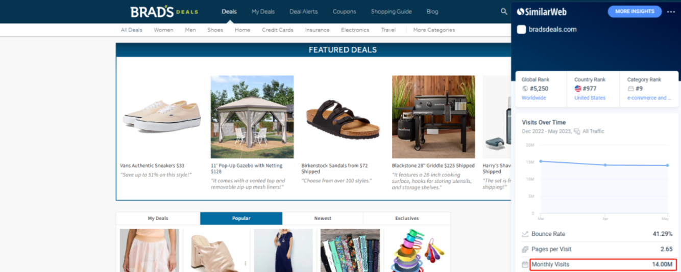②Brad’s Deals:这是美国唯一一个按效果付费的Deal站,平台一般会抽3-8%销售佣金,月访问量14M,最重要的是,不像其它网站一直动辄要50%的折扣,这个网站30%OFF也照样能爆单。网站访客桌面端和移动端的流量比例在2:8左右,主要是通过移动端访问的。Bradsdeals的访客出站主要是到亚马逊美国站amazon.com,说明这个网站特别适合亚马逊美国站卖家上帖做站外deal站推广。