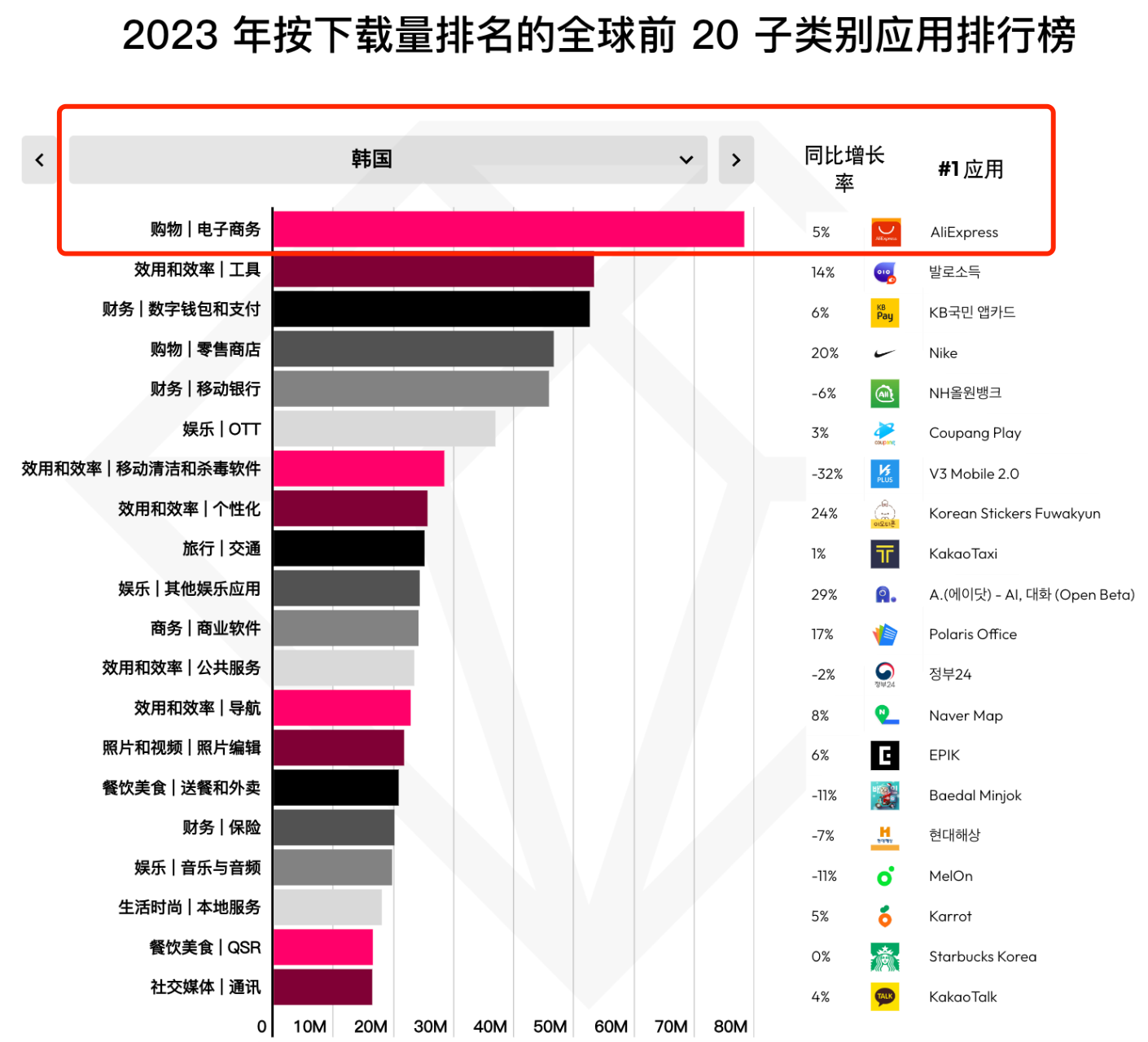 以全球排名第5的韩国市场为例,data.ai数据显示,速卖通是2023年韩国下载量最大的购物APP。