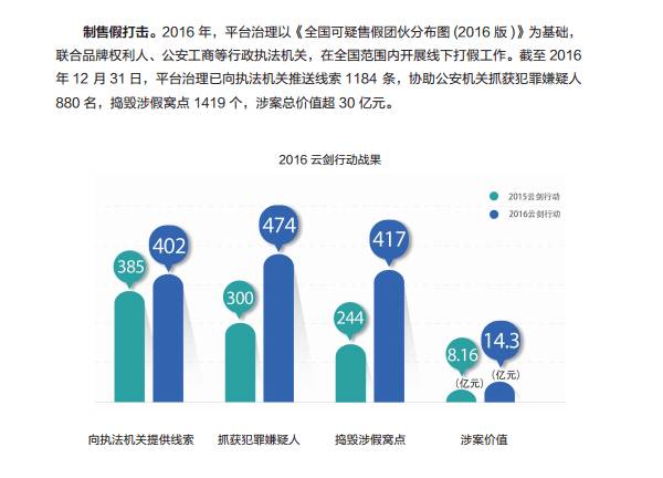 据介绍,截至2016年12月31日,平台治理共向公安机关提供线索1184条,协助警方抓获犯罪嫌疑人880名,捣毁涉假窝点1419个,破获案件涉案总金额超30亿元,是2015年的两倍。
