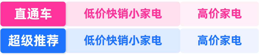 为充分利用好直通车&超级推荐计划两个展示位,商家小B根据店铺推广品类进行分类,将商品分为低价快销小家电和高价家电两类,共开设4个计划,并根据计划表现,分别放入不同权重的预算。