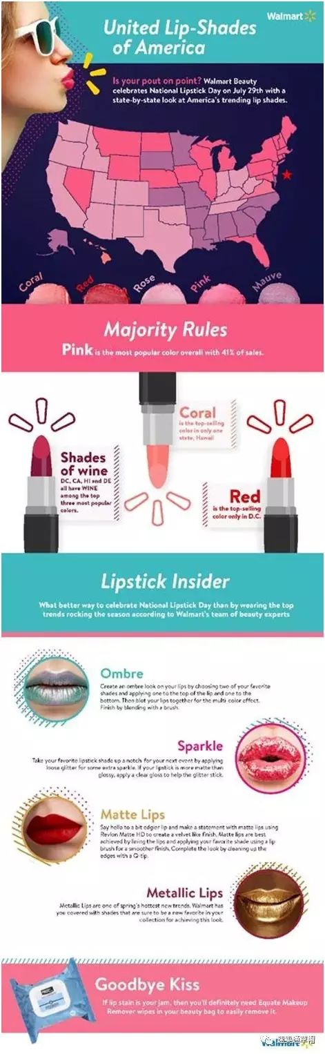 近日,沃尔玛根据其门店的销售数据,制作了一个有趣的信息图,显示出美国各个州最畅销的口红颜色。