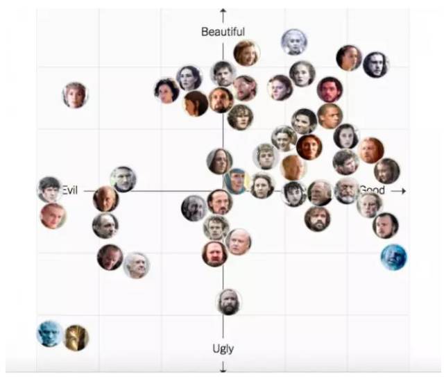 现实中权游有多火?纽约时报为其发起了“50个角色善美恶丑坐标图”游戏,你可以按坐标给角色定位,有近10万名用户参与投票。