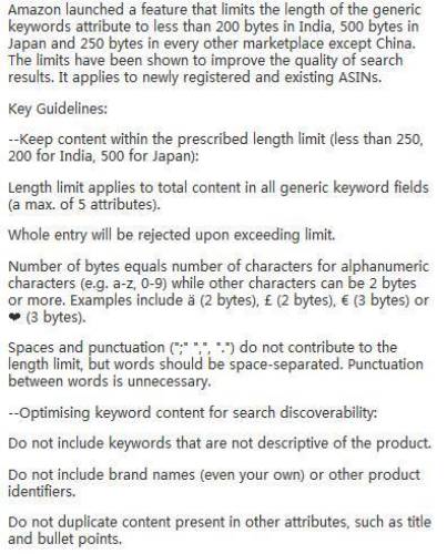 通告中,亚马逊官方对Search Term关键词的字符数做出了明确的确定:印度站(IN)的Search Term关键词最多索引为 200个字符,日本站(JP)为 500个字符,而其它站点都是250个字符(除了中国站)。这里的其它站点自然是包含美国站了。