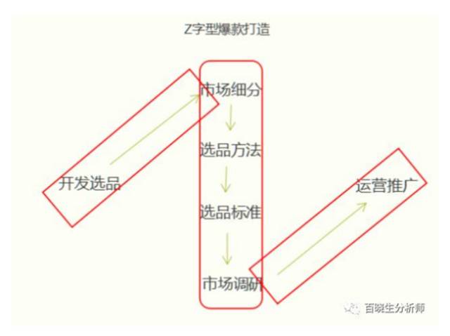 以上图为例,他特别提醒卖家朋友:“铺货路线一定程度上违反了市场营销的本质,精品路线则相对而言更适合于广大中小卖家,值得考虑!”而对于开发选品“Z”字型打法,百晓生透露,一款成功的爆款产品开发必然有这些因子所组成:第一,前期的选品开发;第二,必要的市场细分;第三,合理的选品方法;第四,正确的选品标准;第五,清晰的市场调研;最后,恰当的运营推广。