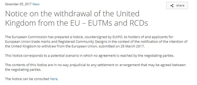 近日,欧盟知识产权局官网上忽然发布了一条通知,就英国脱欧后欧盟商标和外观设计在英国境内的效力作出说明。