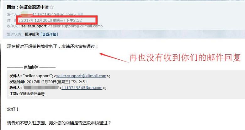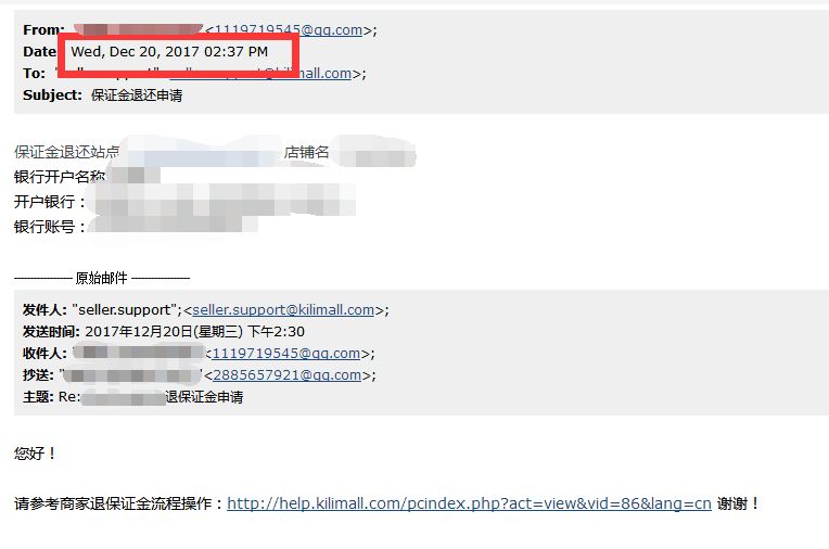 于2018年1月2日,我在查阅邮件的时候,突然看到了12月20日与Kilimall的联系记录,想起了差不多半个月前提交的退押金申请,于是找到了客服咨询。
