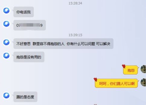 发到群里@他们的群主,心里想着或许这就是个大佬吧,能给个处理方法。然后发完没多久,客服1 出来了把我踢了。理由却是:不好意思,群里容不得抱怨的人,还很正义凛然的说,踢我是态度。