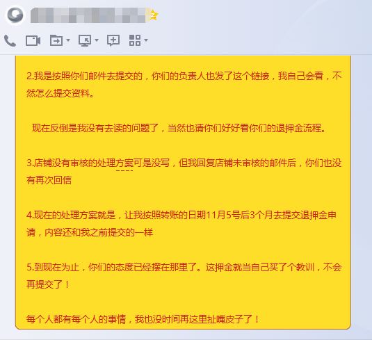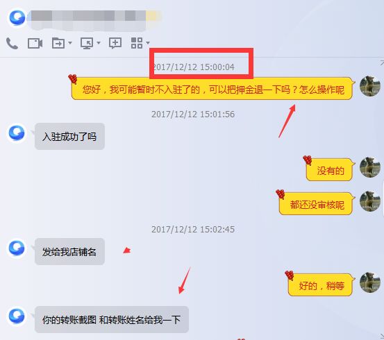 3. 然后12月12日 ,由于搬砖族比较忙,时间有限,所以再三考虑,没有再打算深入此平台。所以没有再次提交审核资料,所以店铺还是处于未审核的状态,咨询客服怎么操作退押金,按照客服1的回复操作。