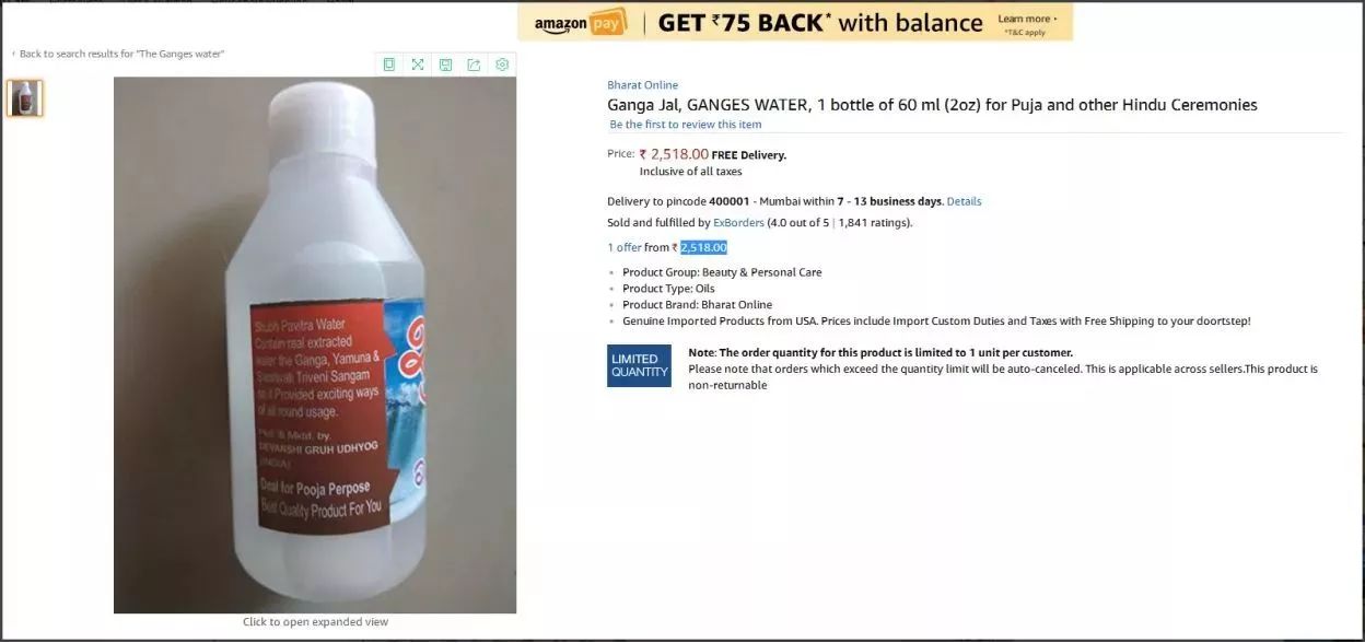 这不,一些聪明的印度商家已经上架该产品,而且价格不菲,居然一桶高达2518卢比,换算成美金也是37美金。如此高价的“圣水”,印度卖家居然还担心会抢购一空!