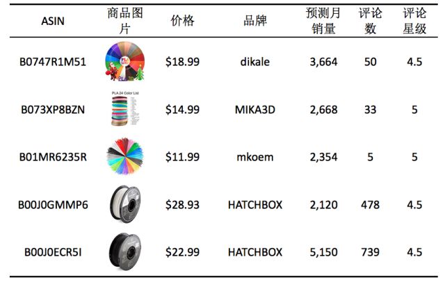 本文选取2017年12月亚马逊美站Best Sellers榜单中3D Printing Filament品类下的Top100商品作为市场研究目标。