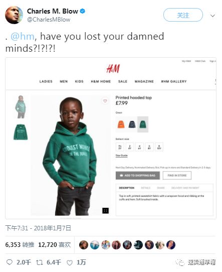 1月8日,推友Charles M. Blow表示:“@hm,你疯了吗?!”