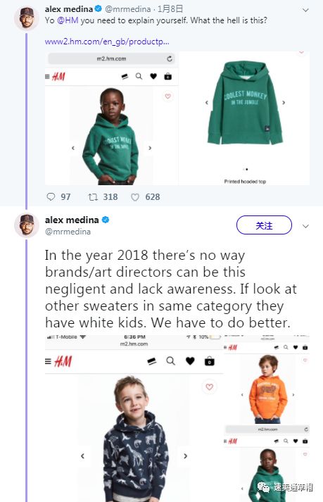 1月8日,设计师Alex Medina在Twitter上表示:“2018年,品牌和设计总监不应该疏忽大意,或缺乏种族意识。如果查看相同品类的其他上衣,它用的是白人儿童模特。”