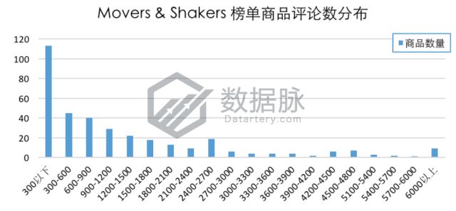 在1月4日至10日登榜Clothing, Shoes & Jewelry品类Movers & Shakers榜单的商品中,单个商品拥有的最大评论数为10320.0,最小评论数为1.0条,平均评论数1508.35条,评论平均星级4.27星。骆探长 (shujumai.com)发现,在上榜的商品中,有23.79%的商品评论数不超过300条,另有9.47%的商品评论数在300条至600条之 间,8.42%的商品评论数在600条至900条之间。此外,有9款商品的评论数在6000以上,占上榜商品总数的1.89%。