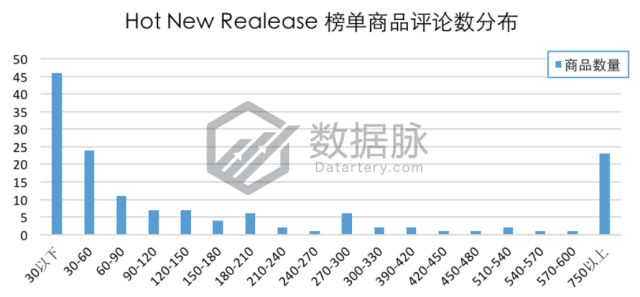 在1月4日至10日登榜Clothing, Shoes & Jewelry品类Hot New Releases榜单的商品中,单个商品拥有的最大评论数为8678.0,最小评论数为0.0条,平均评论数590.86条,评论平均星级4.35星。其中,28.05%的上榜商品评论数不超过30条,另有14.63%的上榜商品评论数在30条至60条之间。此外骆探长(shujumai.com)发现,有22款上榜商品的评 论数超过了750条,占上榜商品总数的14.02%,相较于前几期分析,这七天中上榜商品的平均评论数略有回升。
