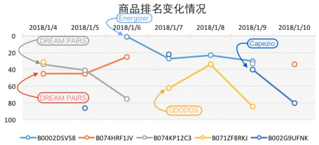 可以看到,在1月4日至10日Clothing, Shoes & Jewelry品类的Movers & Shakers榜单中,商品竞争较为激烈,没有一款商品能够在7天中登榜5次,而一款来自品牌Energizer的纽扣电池两件套则在激烈的竞争中脱颖而出,自1月6日开始连续四天进入Movers & Shakers榜单,平均排名达20.25,成功占领综合排名首位。