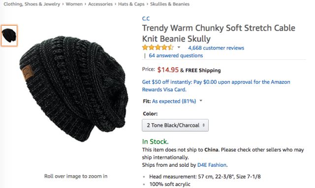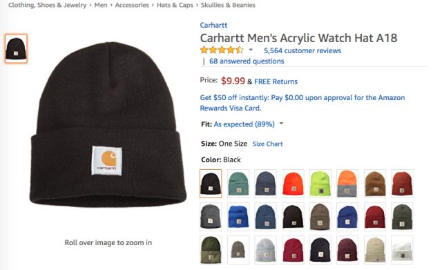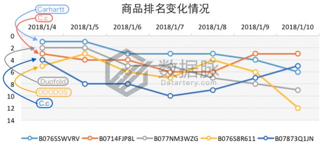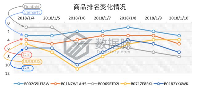 可以看到,在1月4日至10日的Clothing, Shoes & Jewelry品类的Best Seller榜单中,针织帽产品继续受到了榜单的关注,位列综合排名前五的商品中共有三款针织帽产品——其中,来自品牌Carhartt的男士针织帽延续了前几周中的优秀 表现,于2018年1月8日成功登顶Best Seller榜单首位,以平均排名2.29的成绩再次领跑商品综合排名首位;