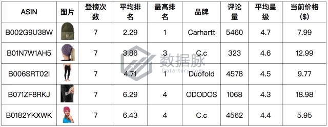 于此同时,两款来自品牌C.c的女士针织帽也继续紧随其后,分别以3.86与6.43的平均排名占领综合排名第二第五位。
