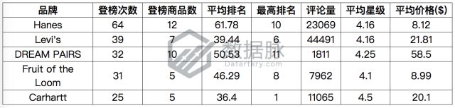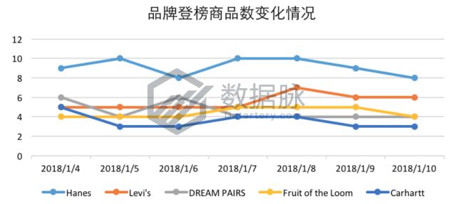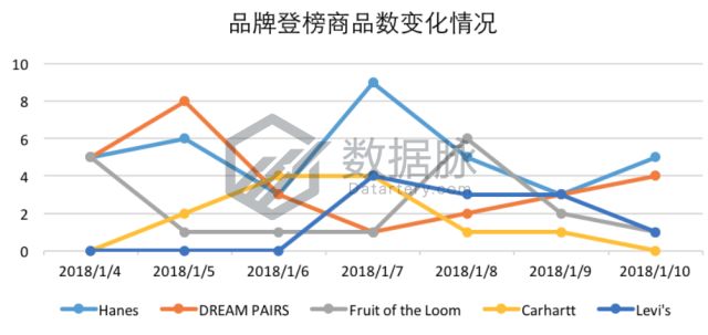 可以看到,在1月4日至10日的Clothing, Shoes & Jewelry品类的Best Sellers榜单中,品牌Hanes继续扛起品牌“老大哥”的大旗,在七天中夺下64次登榜次数,蝉联品牌综合排名首位。此外,几个常年位居榜单前列的服装品牌巨头在1月4日至10日也同样有着稳定的榜单发挥,骆探长(shujumai.com)发现,品牌Levi's、DREAM PAIRS、Fruit of the Loom也在这几天中分别登榜39次、32次与31次,位列品牌综合排名第二、三、四名。