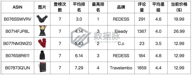 可以看到,在1月4日至10日Clothing, Shoes & Jewelry品类的Hot New Releases榜单中,防寒手套再次成为了市场关注的一大焦点,其中一款来自品牌REDESS的皮制女士手套在1月4日与5日两天中成功登顶榜单首位,在激烈的榜单竞争 中取得了平均排名3.00的不错成绩,位列综合排名首位,而品牌C.c的针织手套产品也在7天中多次跻身榜单前五,取得了平均排名5.43的不错成绩。