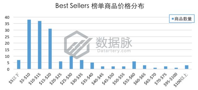 在1月4日至10日中Clothing, Shoes & Jewelry品类Best Sellers榜单商品最高价$149.99,最低价$1.99,平均价格$21.37。其中,价格分布在$10.00-$15.00区间内的上榜商品数量依旧较多,占比达20.42%,同时有19.89%的上榜商品定价于$5.00-$10.00价格段,另有16.67%的上榜商品定价在$15.00-$20.00区间。此 外骆探长(shujumai.com)发现,相比于上期分析,该周中进榜Best Sellers榜单商品的平均价格出现回落,在该周上榜Best Sellers榜单的商品中,仅有3款商品的价格超过了$100.00,占比1.61%。