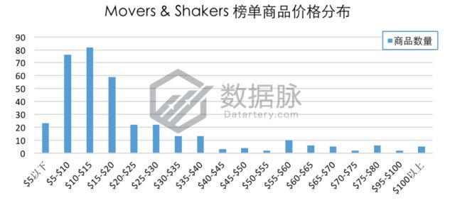 1月4日至10日Clothing, Shoes & Jewelry品类Movers & Shakers榜单商品最高价$159.99,最低价$0.51,平均价格$22.46。骆探长(shujumai.com)发现,其中价格位 于$10.00-$15.00价格段中的商品最多,占上榜商品总数的17.26%;同时,有16.00%的上榜商品数定价于$5.00-$10.00价格段; 此外,上周有5款商品价格达$100.00以上,占上榜商品总数的1.05%。相比于上期分析,这七天中上榜的商品平均价格略有下降,低价商品对BSR排名的 冲击力略有上升。