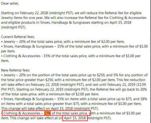 即将执行的新佣金:珠宝:总售价不超过250美元的部分,收取20%;超过250美元的部分,收取5%,每件最低收费2.00美元。此费用减免将于2018年2月22日生效,有效期至2019年2月21日。从2019年2月22日开始,佣金仍旧按照总售价的20%收取,每件最低收费2.00美元。鞋子,手袋和太阳镜:总售价不超过75美元的商品收取15%,总售价高于75美元的商品收取18%,每件商品至少要收1.00美元。此项更改将于2018年4月15日生效。服装和配饰:收取总售价的17%,每件最低收费1.00美元。此更改将于2018年4月15日生效。
