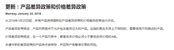 据了解,产品差异政策规定,产品列表里中不允许包含差异过大的产品。这指的是在本质上不相同的、需要使用不同描述的产品;价格差异政策规定,在一个产品列表中,最高变体价格必须小于最低变体价格的4倍。 据悉,产品和价格差异政策将在2018年1月25日生效。未遵守新的差异政策的产品将会被移除,并且账户有暂停交易的风险。