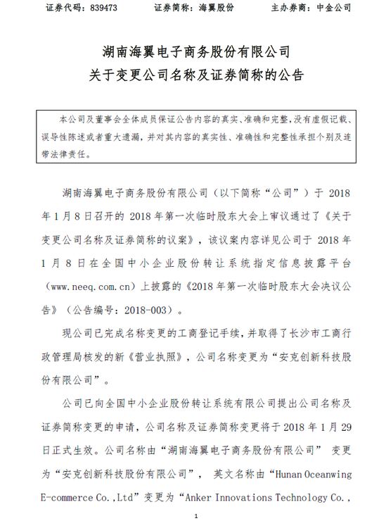 据公告称,公司名称由“湖南海翼电子商务股份有限公司” 变更为“安克创新科技股份有限公司”, 英文名称由“Hunan Oceanwing E-commerce Co.,Ltd”变更为“Anker Innovations Technology Co.,Ltd”,公司证券简称由“海翼股份”变更为“安克创新”,公司证券代码为839473,保持不变。目前,公司已完成名称变更的工商登记手续,并取得了长沙市工商行政管理局核发的新《营业执照》。公司已向全国中小企业股份转让系统有限公司提出公司名称及证券简称变更的申请,公司名称及证券简称变更将于2018年1月29日正式生效。