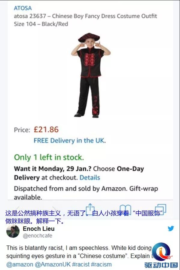 据外媒消息报道,卖家“ATOSA”与“Fyasa”以“中国男孩舞会服装”为名,在亚马逊和eBay的英国网站上刊登了上述广告图片,相关服饰售价在21至22英镑(约188至197元)之间。事件导火索就是这张图片上,白人男孩身穿传统中国服饰,同时用手指向自己的眼角。大批华裔人士看完后都感到十分愤怒,他们把广告截图发上社交平台,要求购物网站移除相关页面。说到这里,不得不解释一下“眯眯眼”这个动作。在欧美国家看来,“眯眯眼”被特指是歧视亚洲人的行为,约定俗成。英文中甚至有词汇chink(译为窄眼、小缝隙)作为种族性的污辱用语,其对象是中国人、华人或东亚人。