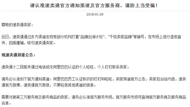 平台通过多方渠道发现有部分机构打着“品牌出海计划”、“千级卖家品牌”等旗号,在市场上进行虚假宣传、招摇撞骗,吸引速卖通卖家。 卖家务必要认准如下官方通知渠道:阿里巴巴员工认证标识的钉钉和旺旺,卖家频道官方公告,卖家后台站内信,速卖通官方微博,速卖通官方微信,不要轻信其他渠道的信息。