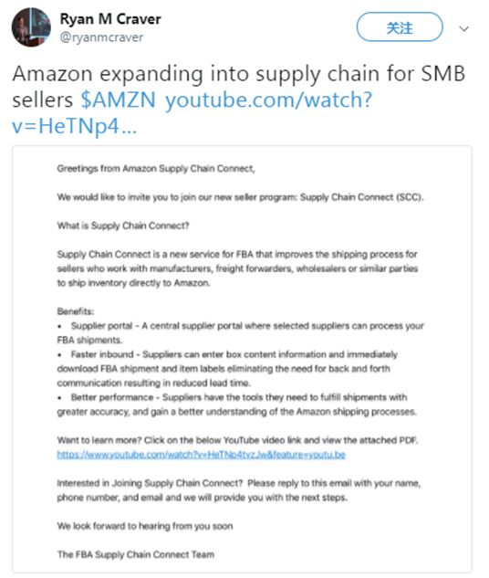 最近,亚马逊为FBA卖家推出了名为“Supply Chain Connect”的项目,旨在提高效率并加强对入库产品的控制。 FBA卖家目前通过两种方式入库。一种是将产品运送到自己所在的位置,包装后再运到亚马逊物流中心。 第二种是让供应商直接将库存运送到亚马逊物流中心,卖家需要在供应商和亚马逊之间进行协调。而有了亚马逊Supply Chain Connect门户,卖家可以直接向供应商发送运送要求,节省了来回沟通的时间。 Ryan Craver在Twitter上发布了亚马逊邀请邮件的截图。