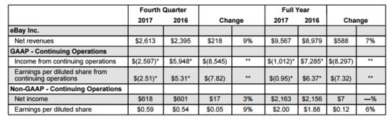 eBay发布了2017财年第四季度财报及全年财报。财报显示,eBay第四季度营收为26.13亿美元,比去年同期的23.95亿美元增长9%。不按照美国通用会计准则(Non-GAAP),第四季度来自于持续运营业务的净利润为6.18亿美元。值得注意的是,eBay第四季度总商品交易额(GMV)为244亿美元,与去年同期相比增长10%,不计入汇率变动的影响为同比增长7%。