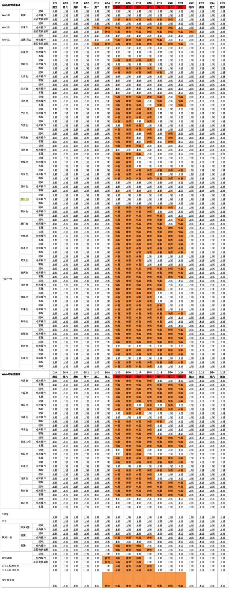 由于2018年春节长假,Wish邮对各物流渠道上班时间做出了相应的调整,具体内容如下: