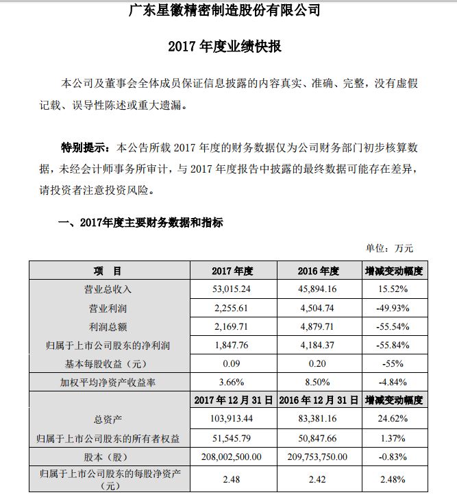 星徽精密在2月底发布了2017年度业绩报告,