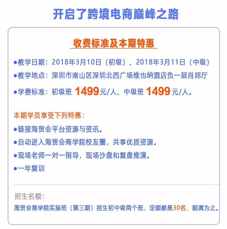 那到底怎么办,怎么没才能缓解跨境电商人的认知焦虑。获取一种能力最快的路径,就是直接向有成功经验的高手学习,最好是手把手的教给你,海贸会商学院就有这样的高手,一套跨境电商系统学习的体系。