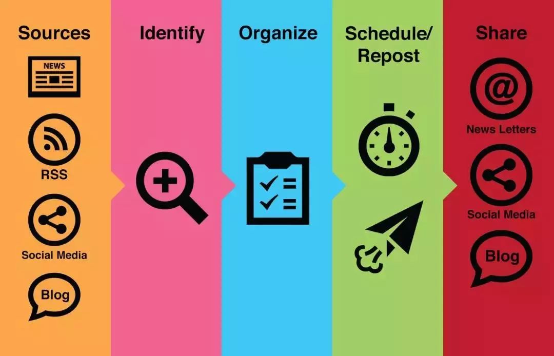汇总编纂的流程:锁定优质内容源(下文有列出)—》筛选内容素材—》组织并重新编纂新的内容—》发布内容—》分享内容到多个平台。
