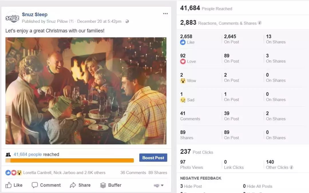 举例来说,我们在刚刚过去的圣诞节,发布了两套不同的贺卡,一套是品牌相关的,另一套只有一张家人团聚吃饭的图片。虽然我们的品牌贺卡做得很精美,结果后者的阅读和互动远远超过前者(获得41684阅读,2883互动),就是因为在这个时刻(圣诞),一张家庭团聚的照片更能够唤起共鸣。