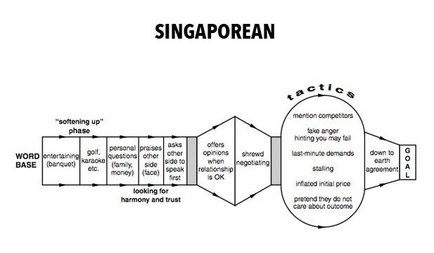 新加坡人:喜欢先跟客户打好关系,比如一起去打高尔夫,聊一些家庭问题等来建立双方的信任,然后当确认关系ok时开始谈判。他们谈判中会提到客户的竞争对手,会暗示客户要求无法达到,或者表现出他们丝毫不介意丢掉这一单,直到双方达成一致。