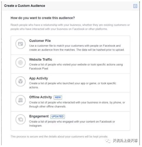 Facebook广告自定义受众群体。在Custom Audiences中,卖家可以上传客户名单,然后Facebook会根据名单数据找到类似受众