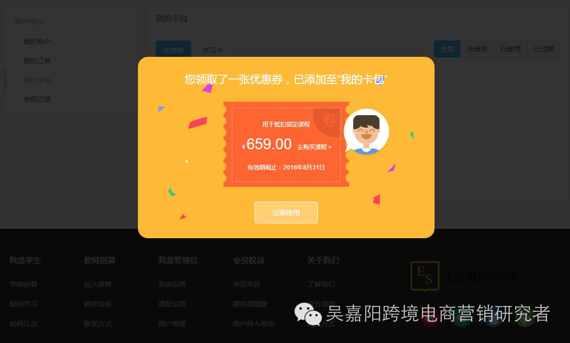 2.ES电商学院上线季期间,每位注册用户只需要推荐自己的朋友在ES电商学院成为学员就能获得56元的代金卷哦,全站通用,同时被邀请人也能获得56元的代金券哦!是不是很划算呢?获取优惠劵的方法也和上面相同哦!