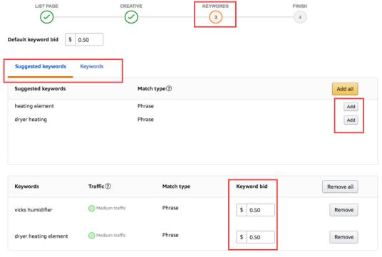 4. 第三步 KEYWORDS ,此步可以设置 关键词(Keywords)和关键词出价。有亚马逊推推荐的关键词,也可以设置自己的关键词。