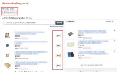 2.第一步Listing Page,可以选择你的品牌>在挑选三个要放上广告的商品点击 Add