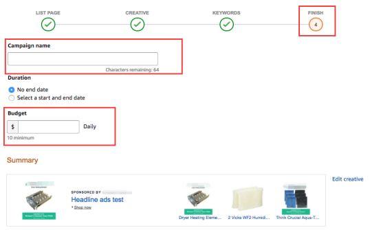 5. 最后一步设置广告组名称,每天的预算(每天最低 10美金)。